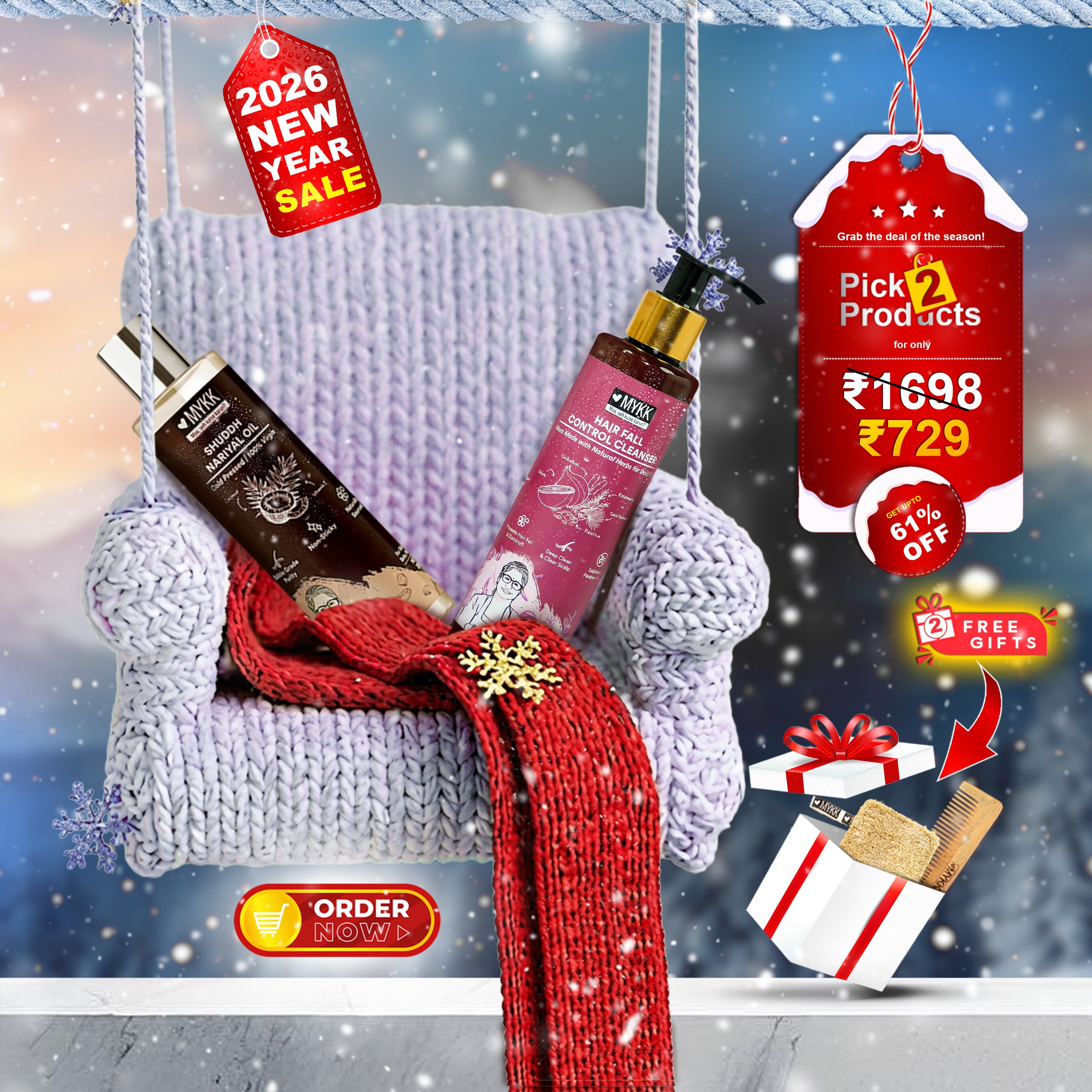 Experience the ultimate natural hair and skin care with the MYKK Shuddh Nariyal Oil and Hair Fall Control Cleanser Shampoo combo.